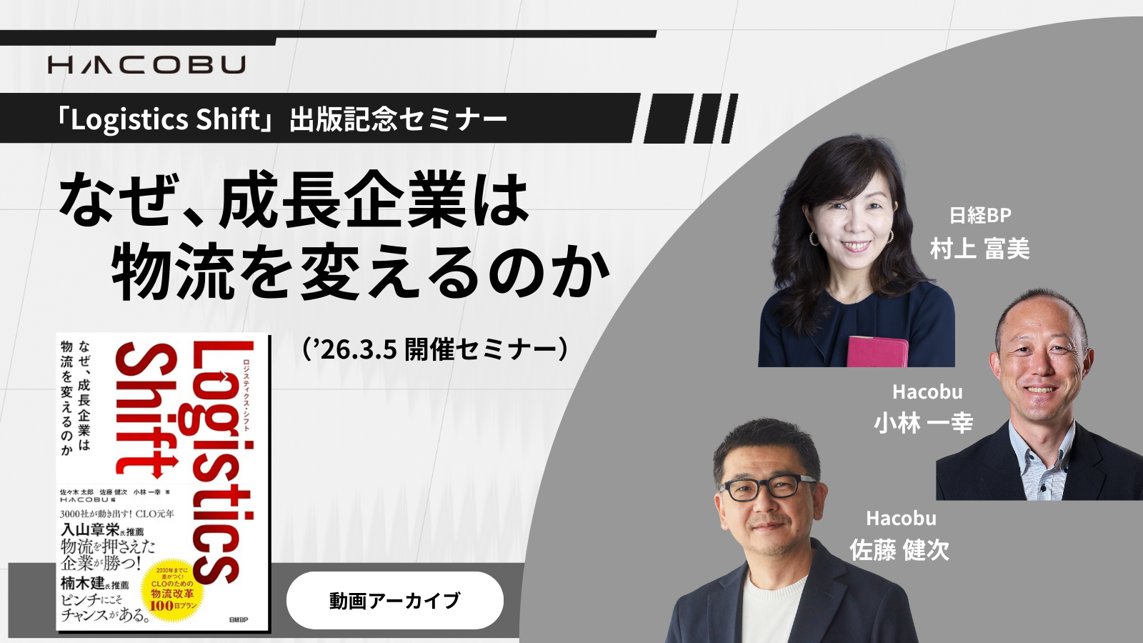 なぜ今「Logistics Shift」が求められているのか、そしてその最前線に立つCLOに求められる物流改革とは何か。元ウォルマートジャパン物流責任者のHacobu 執行役員CSO佐藤と、元野村総合研究所 物流コンサルタントの小林が書籍のポイントを凝縮して解説します。
