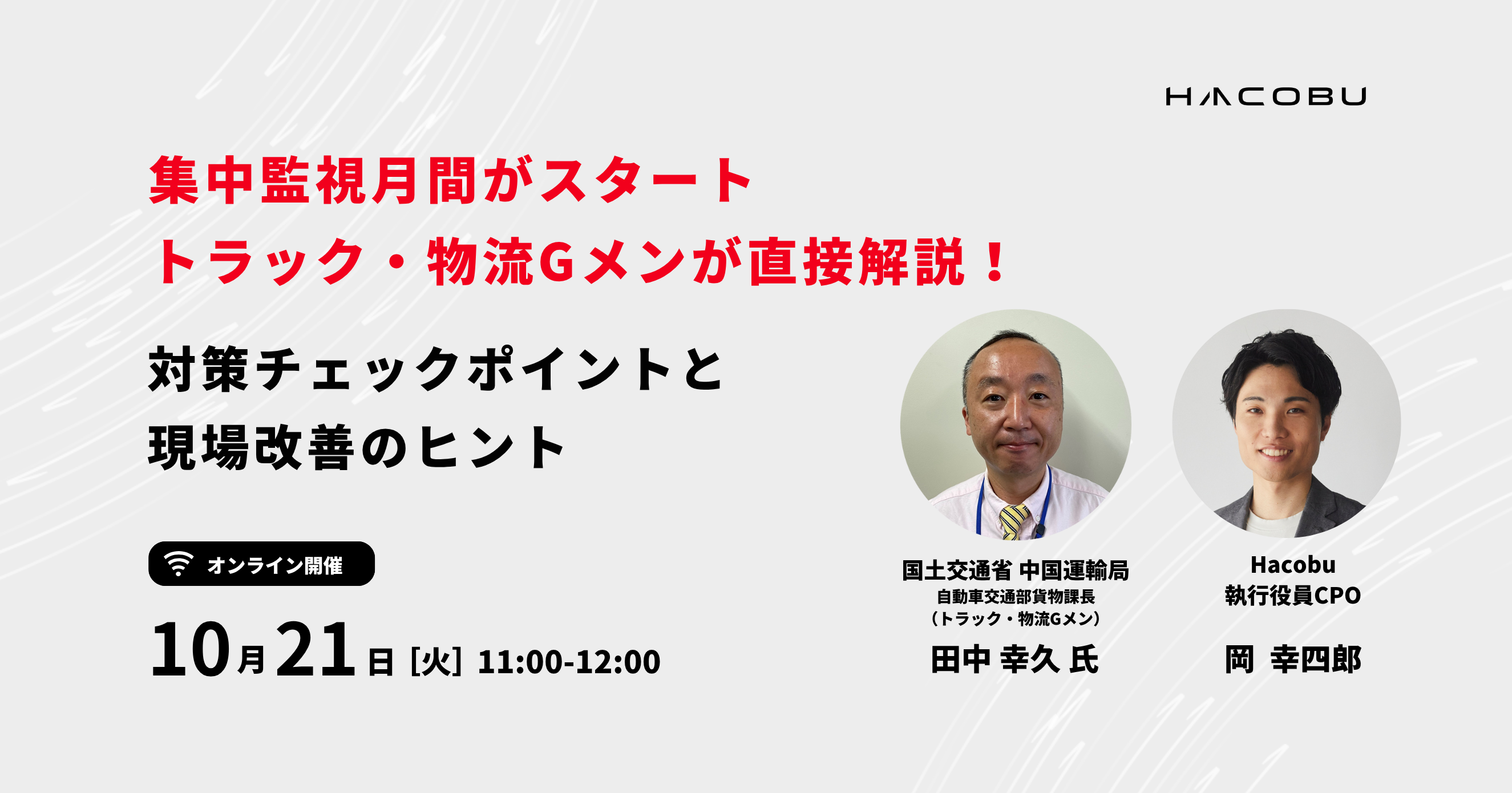 自動車交通部貨物課長 国土交通省トラック荷主特別対策室併任(トラック・物流Gメン) 田中 幸久 氏 1992年運輸省(現 国土交通省)入省。本省大臣官房人事課、政策統括官付政策調整官付(モーダルシフト等予算担当)、自動車局自動車情報課(自動車検査・登録システム予算担当)、同旅客課(公共交通・コロナ対策予算担当)、(独)自動車技術総合機構企画部経営管理課長(併任同機構基盤システム更改担当)等を経て現職に至る。 |