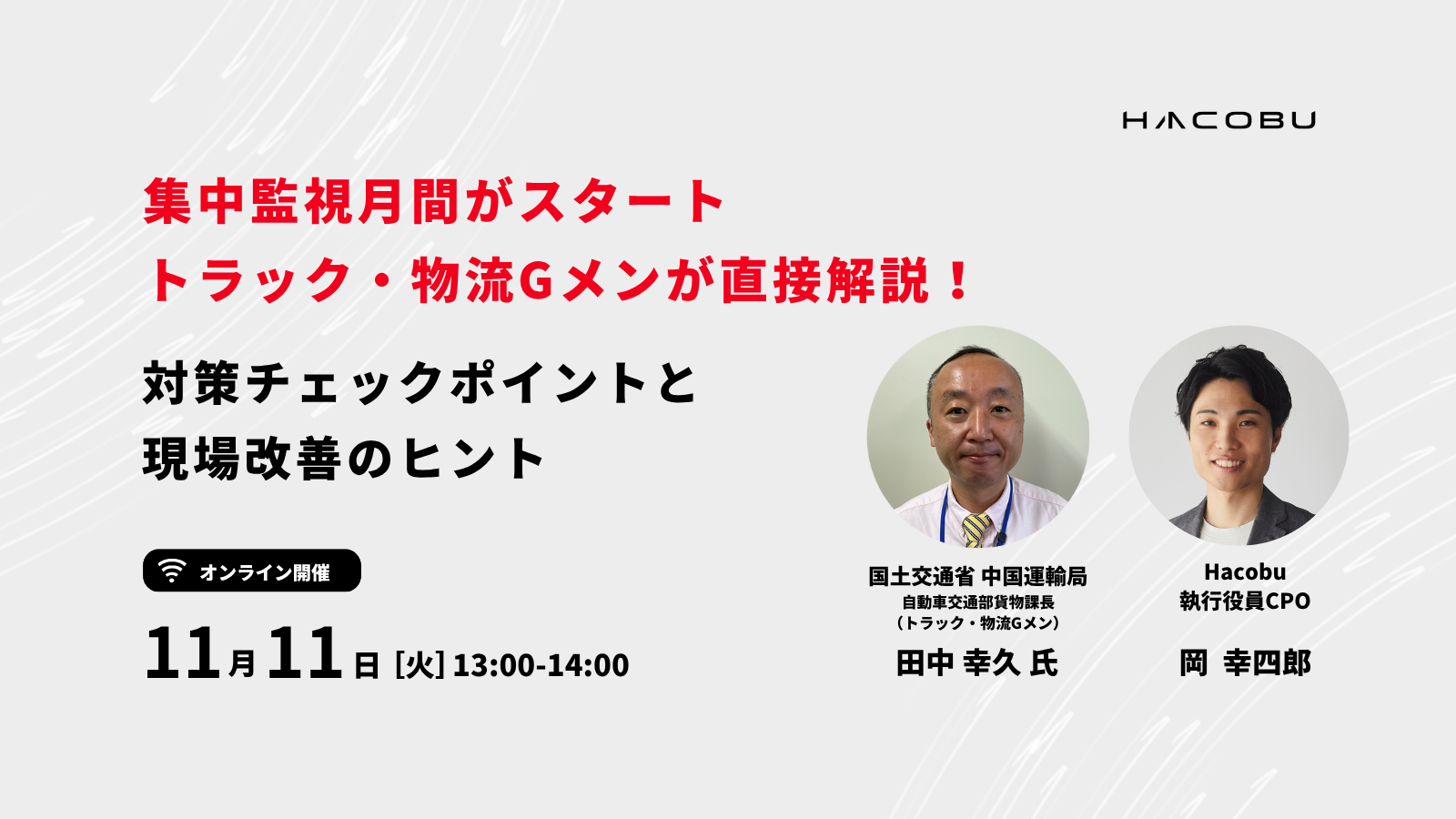 自動車交通部貨物課長 国土交通省トラック荷主特別対策室併任(トラック・物流Gメン) 田中 幸久 氏 1992年運輸省(現 国土交通省)入省。本省大臣官房人事課、政策統括官付政策調整官付(モーダルシフト等予算担当)、自動車局自動車情報課(自動車検査・登録システム予算担当)、同旅客課(公共交通・コロナ対策予算担当)、(独)自動車技術総合機構企画部経営管理課長(併任同機構基盤システム更改担当)等を経て現職に至る。 |