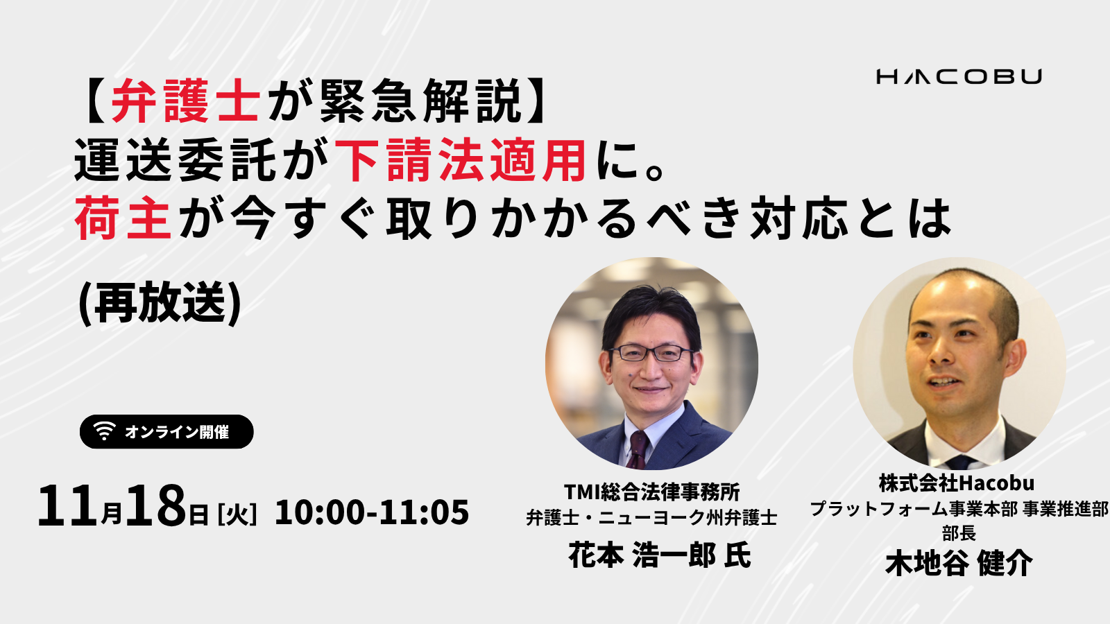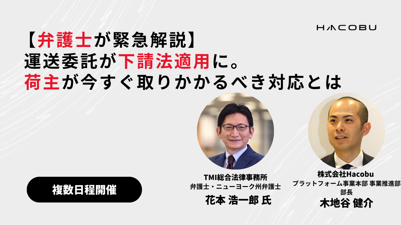 本セミナーでは、弁護士の花本浩一郎氏に登壇いただき、下請法改正の核心を、荷主企業の皆様に向けて分かりやすく徹底解説いたします。