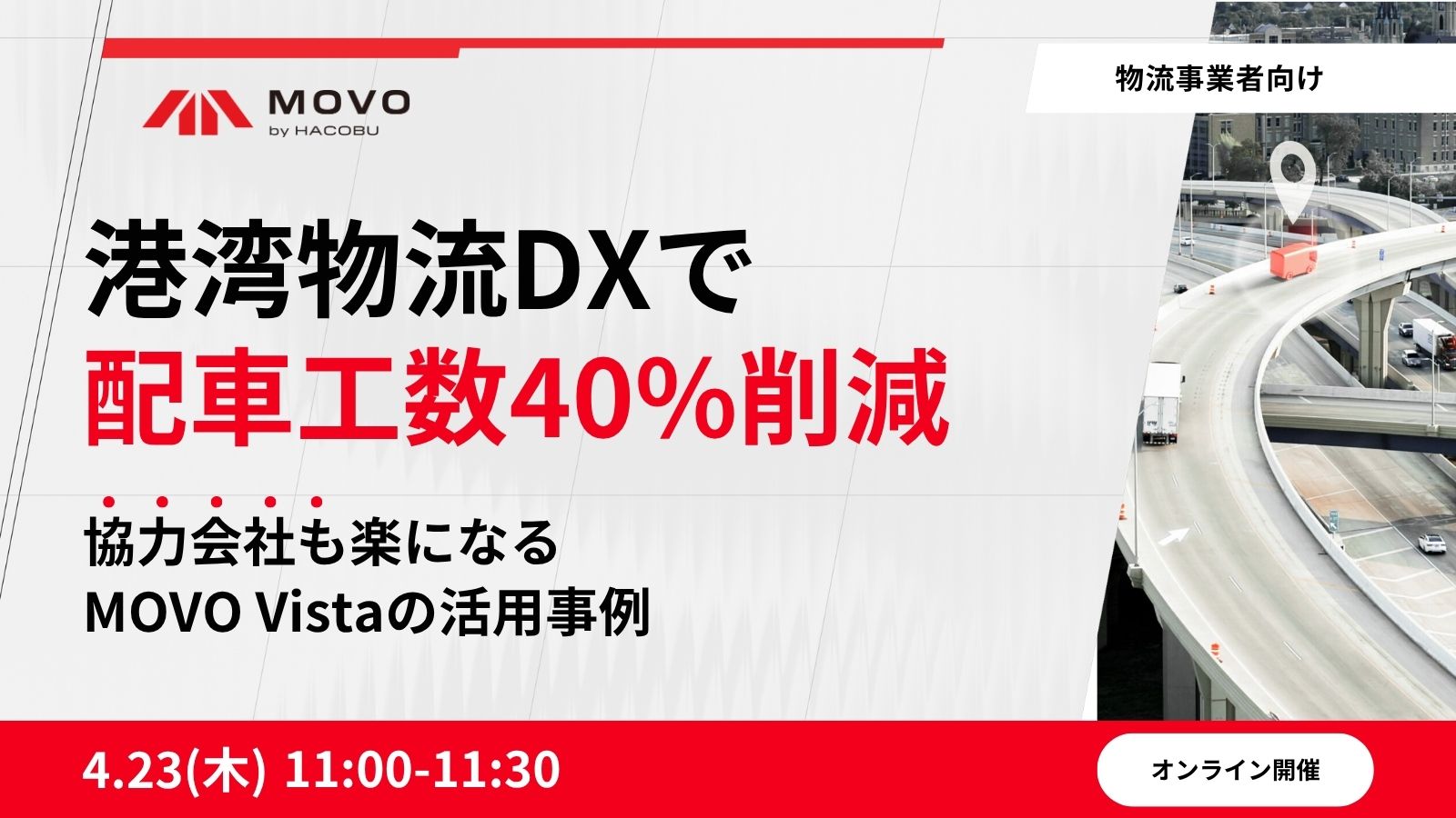本セミナーでは、配車受発注・管理サービス「MOVO Vista」の活用による配車業務の効率化と協力会社連携の改善手法を、月1,500〜2,000件のドレージ手配をこなす後藤回漕店様が、配車工数約40%削減を実現した改善事例を交えて解説します。協力会社にシステム活用の理解をどう得ていったのか、また基幹システムとの二重入力をどのように解消したのかもご紹介します。